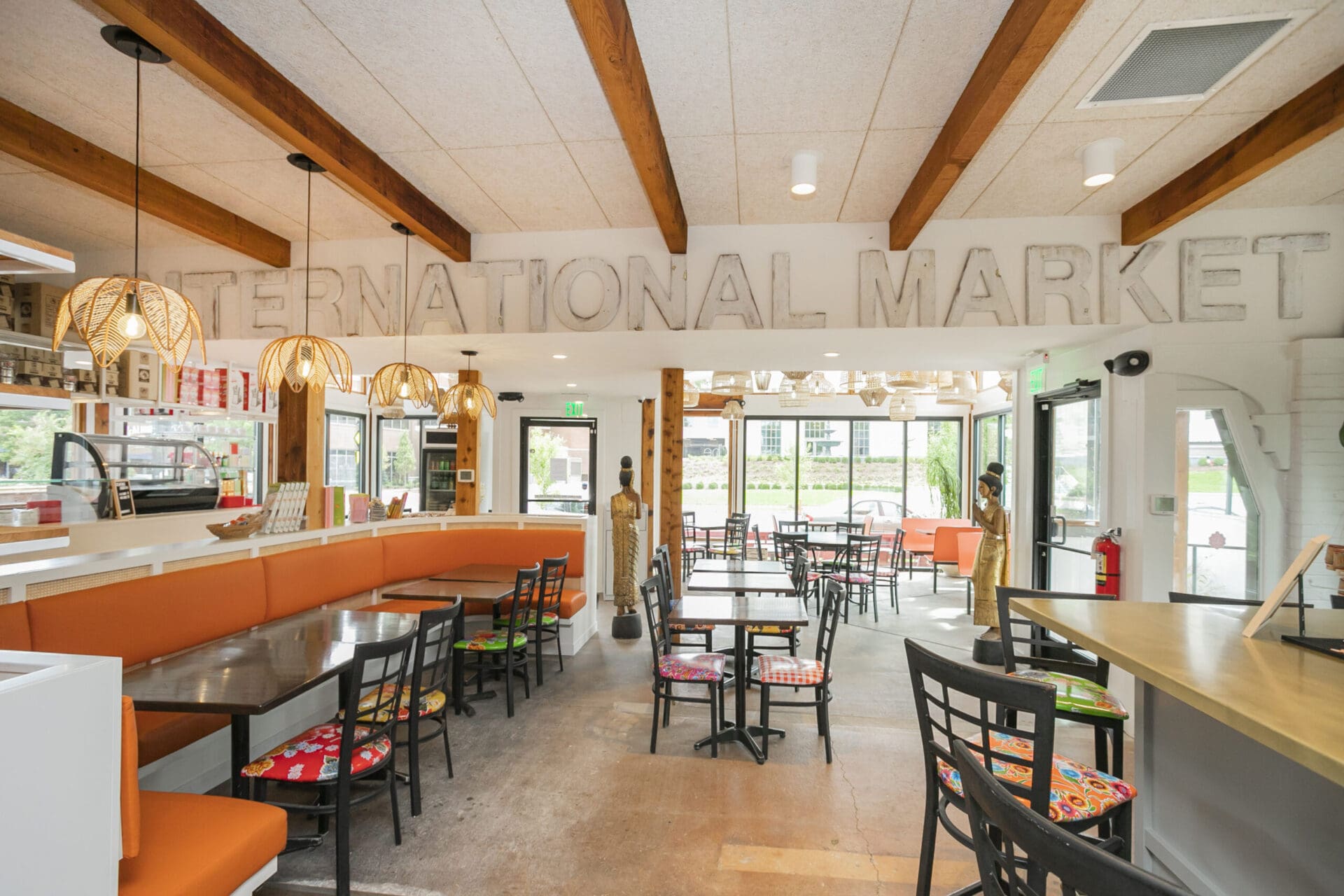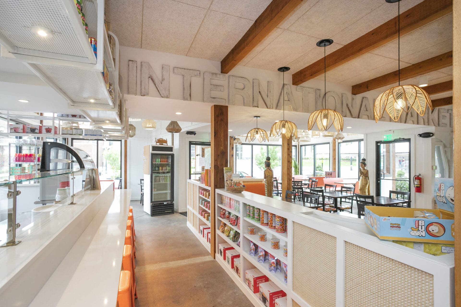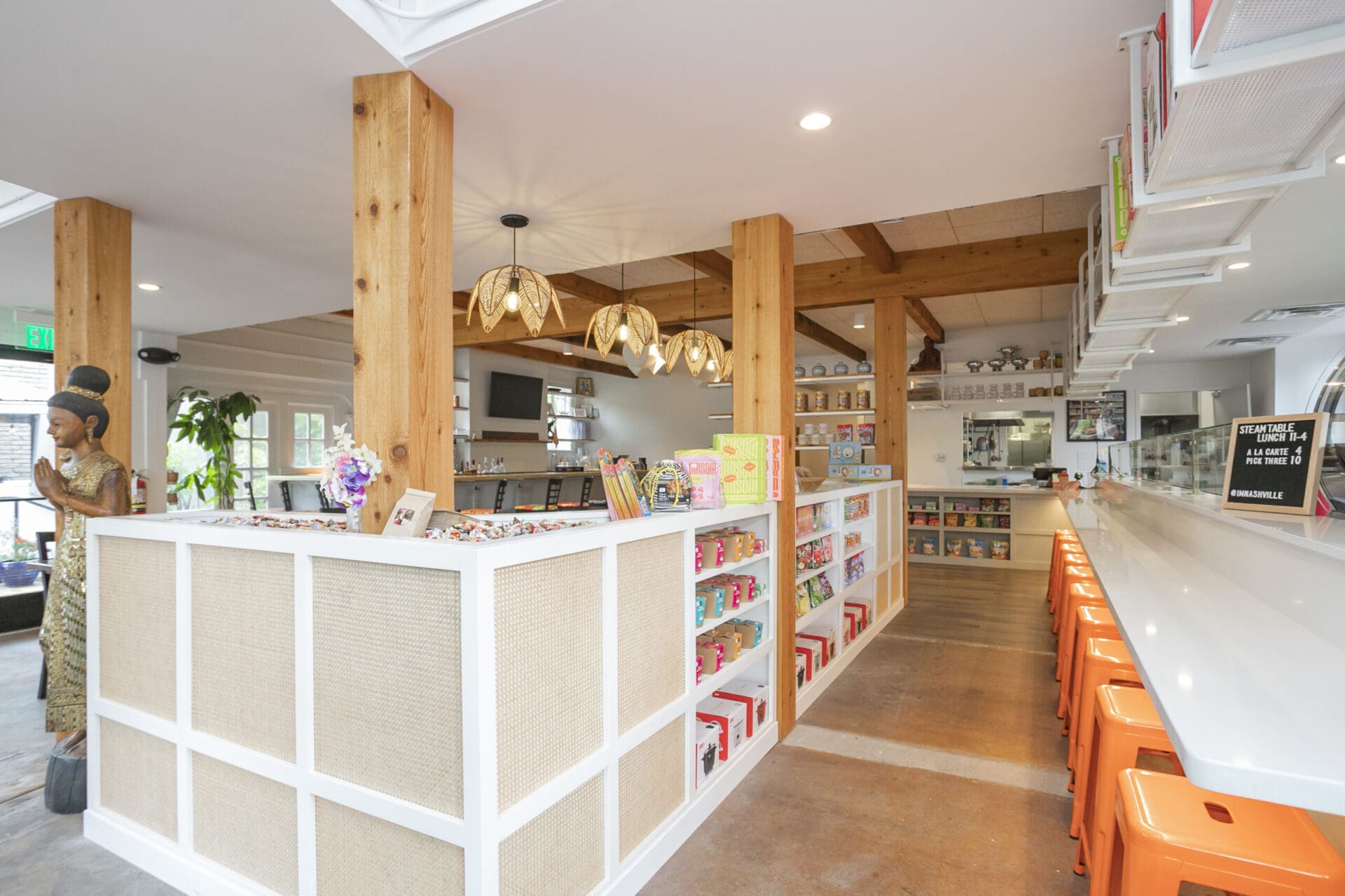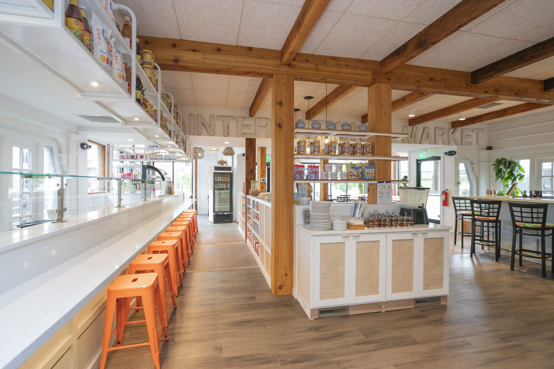 When Nashville's favorite International Market was pushed out of its longtime home on historic Belmont Boulevard after 45 years, Anna and Arnold Myint, the family who owned it, teamed up with MZA to reimagine their family's legacy across the street. Honoring the much-loved original and the need for a fresh start in the new space, MZA created a space that blends seamlessly between nostalgia and hip style. The original bright orange booths and outside signage provide cheerful nods to the past, while teak wood carved doors and graphic orange floor tile provide warmth and character. Strategically selected, the new, bright interior highlights the bright colors of the market's product displays. Now fondly known as IM2, the reborn restaurant and market continues to be a neighborhood institution for everyone who has supported this staple of Nashville’s culture for years.