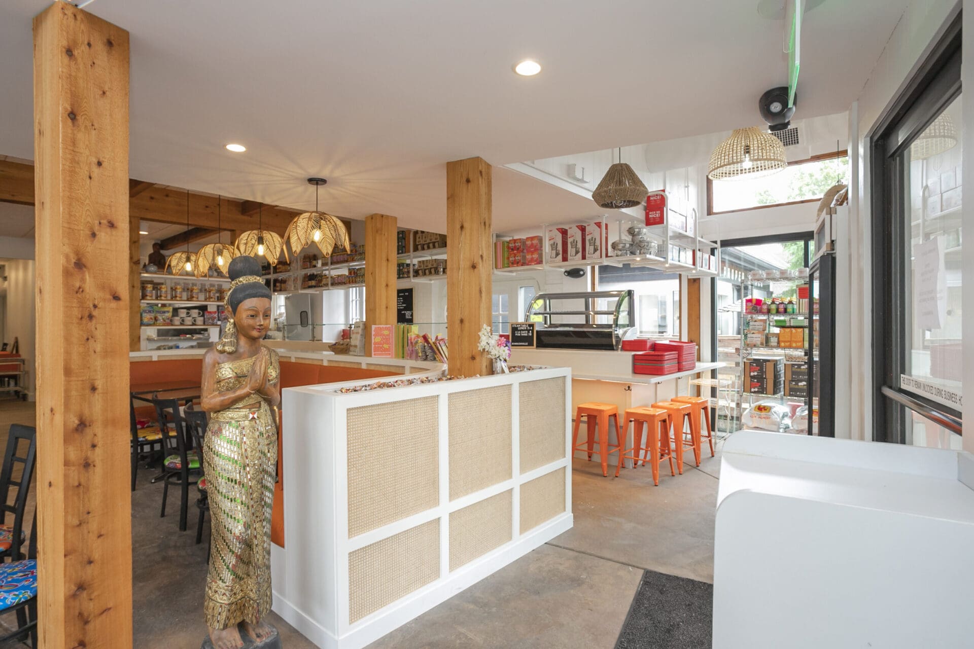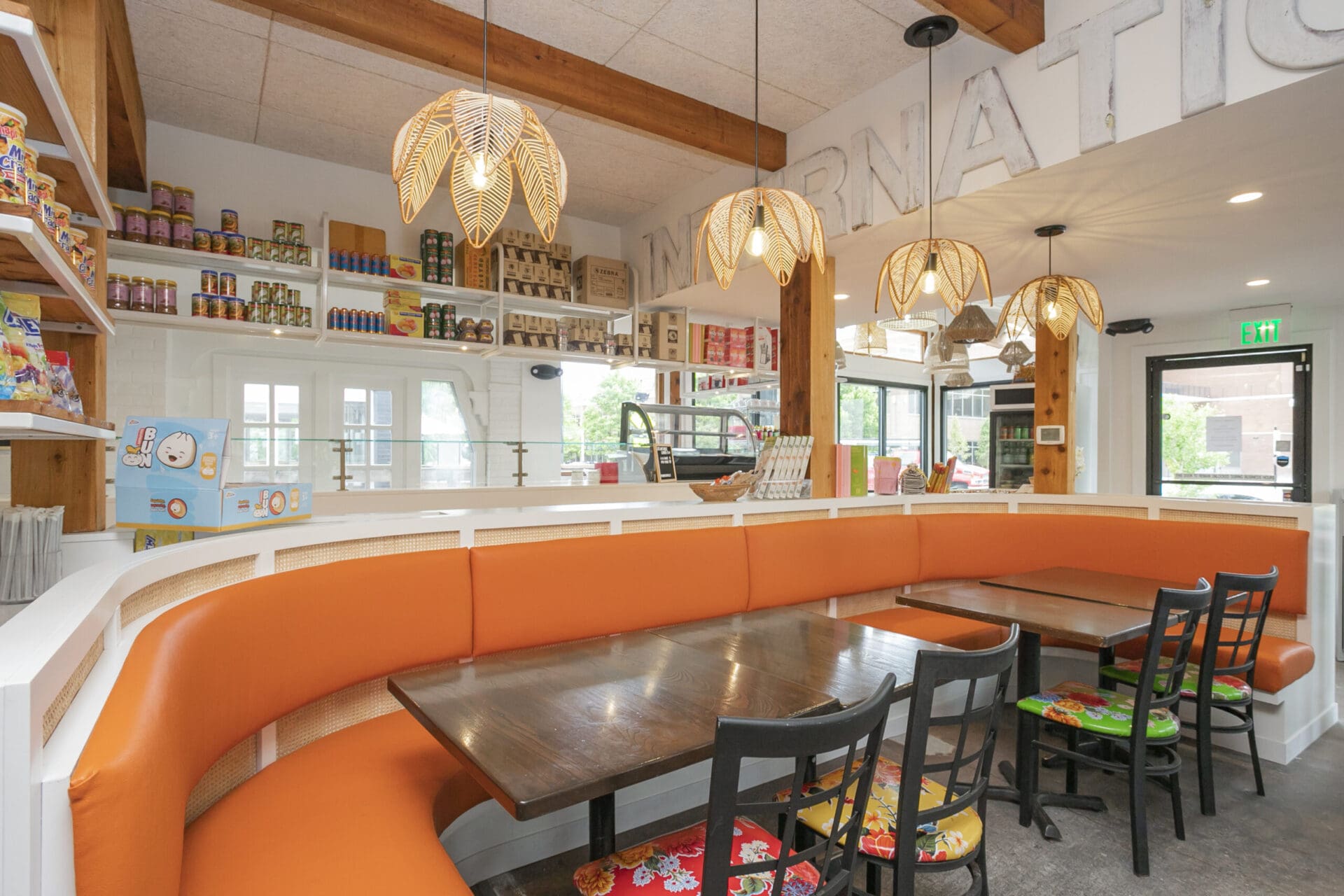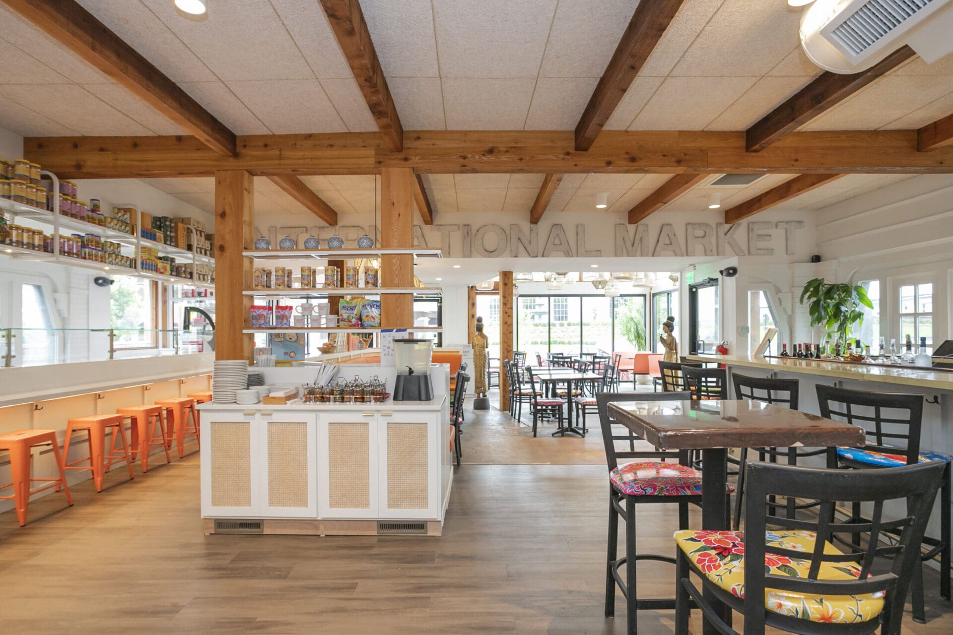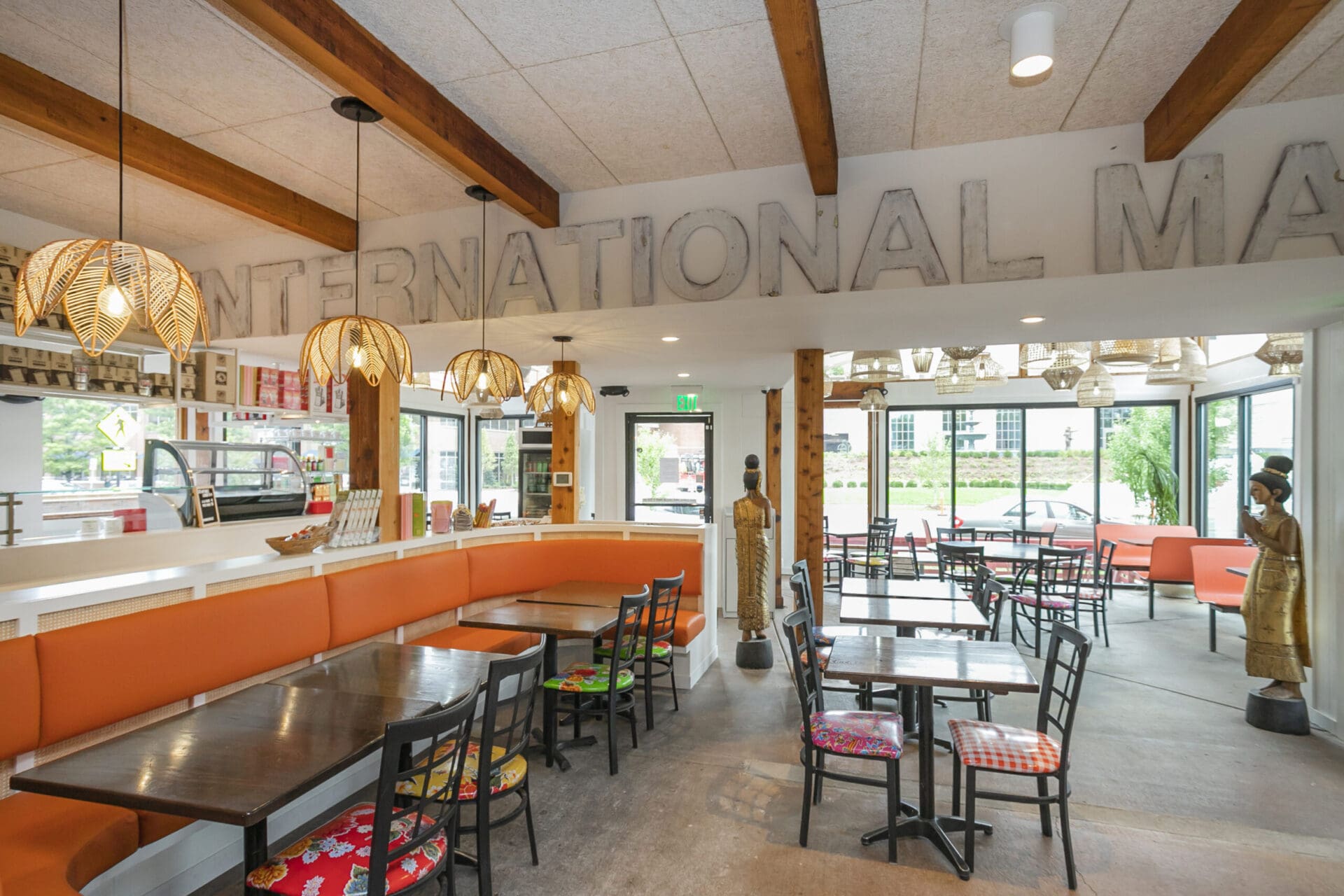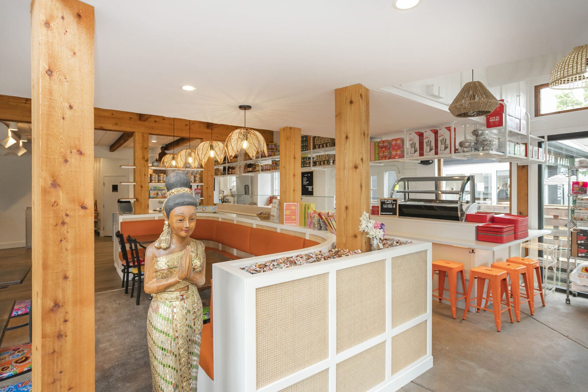 When Nashville's favorite International Market was pushed out of its longtime home on historic Belmont Boulevard after 45 years, Anna and Arnold Myint, the family who owned it, teamed up with MZA to reimagine their family's legacy across the street. Honoring the much-loved original and the need for a fresh start in the new space, MZA created a space that blends seamlessly between nostalgia and hip style. The original bright orange booths and outside signage provide cheerful nods to the past, while teak wood carved doors and graphic orange floor tile provide warmth and character. Strategically selected, the new, bright interior highlights the bright colors of the market's product displays. Now fondly known as IM2, the reborn restaurant and market continues to be a neighborhood institution for everyone who has supported this staple of Nashville’s culture for years.