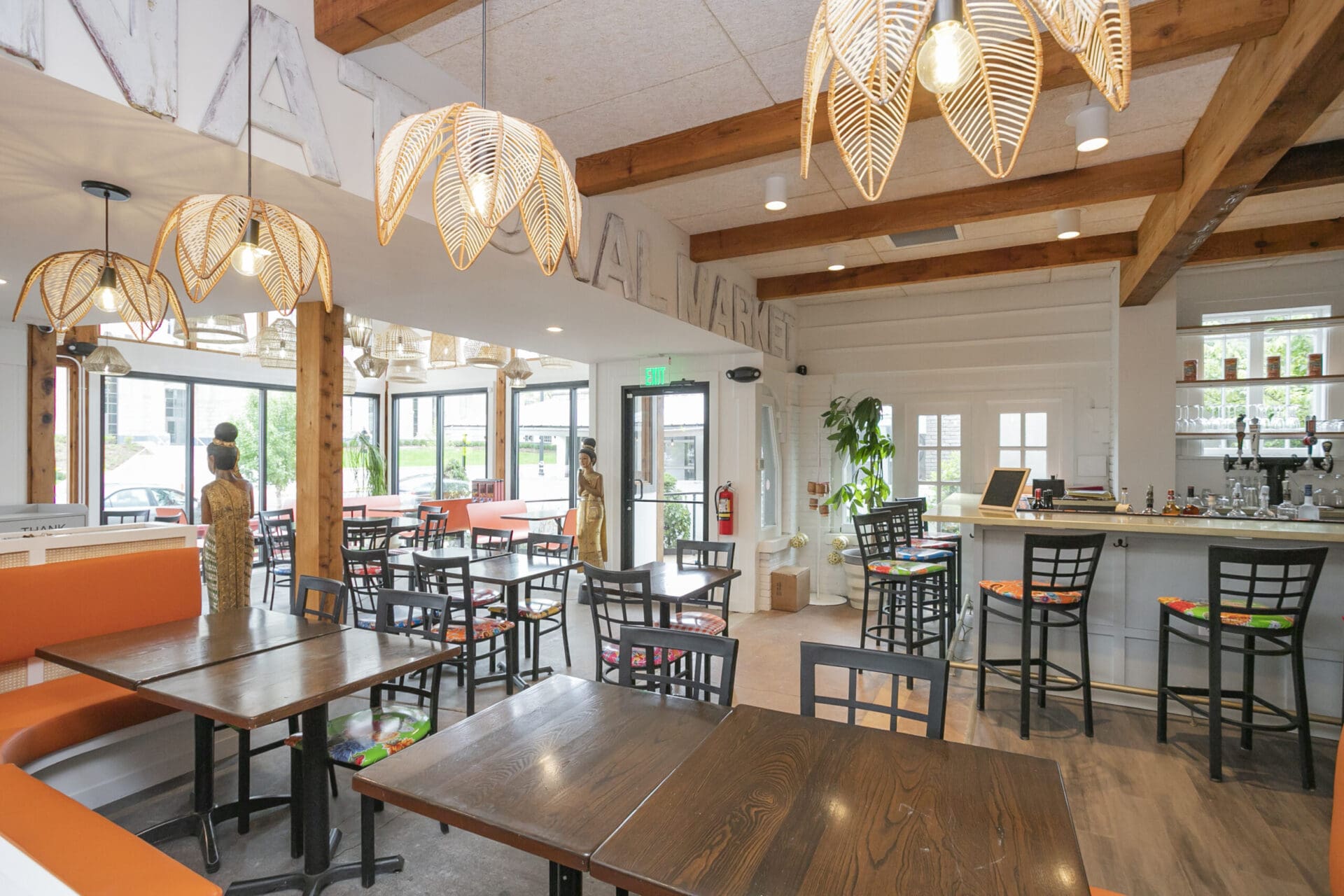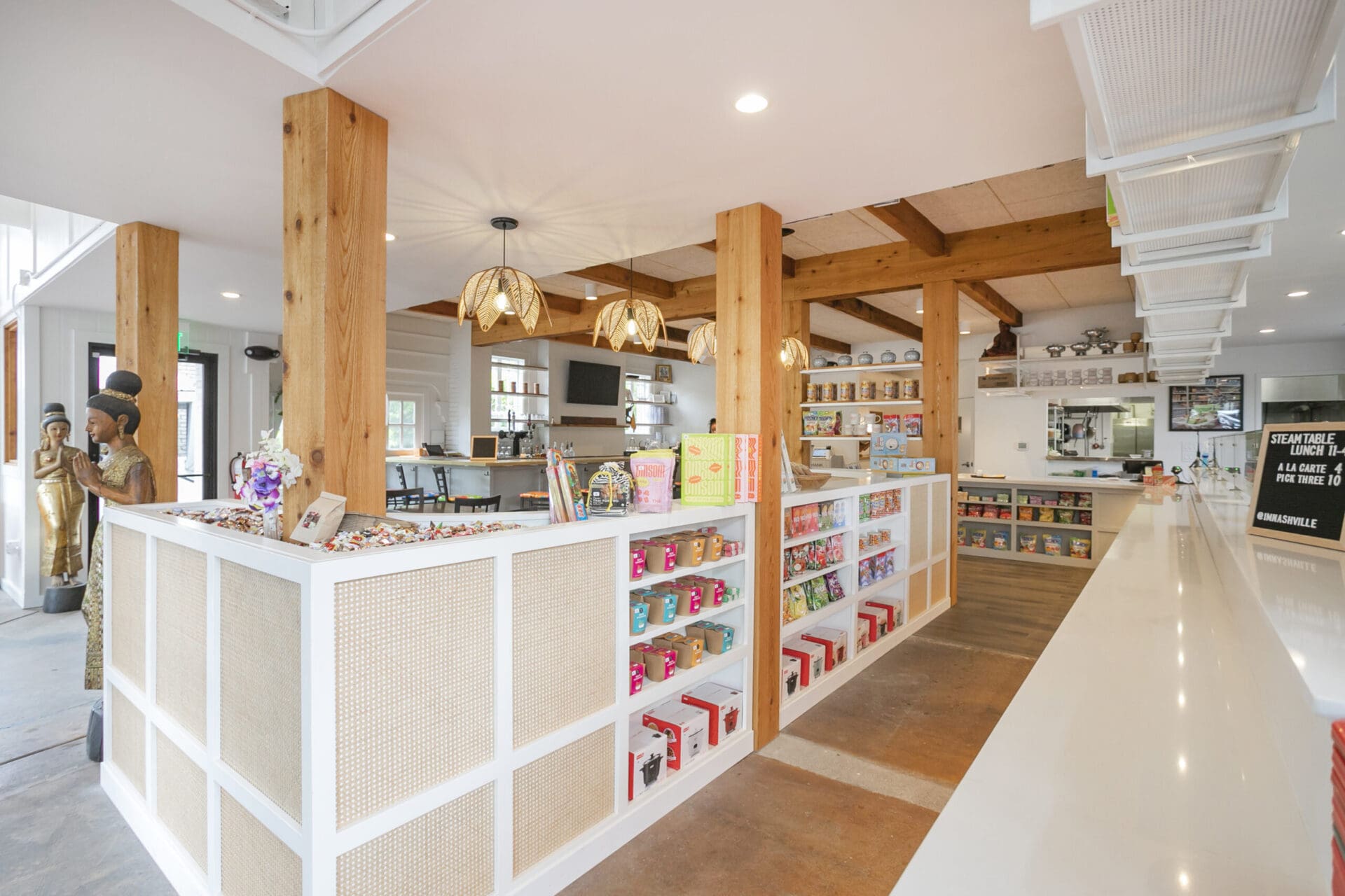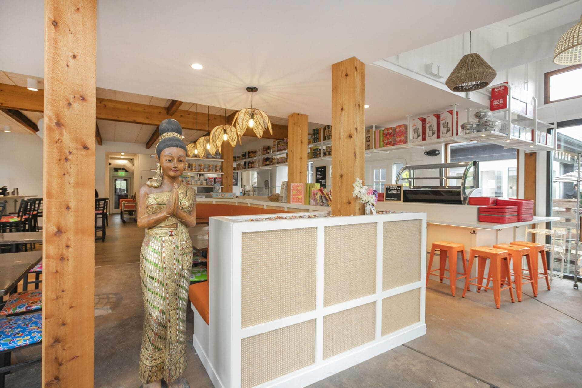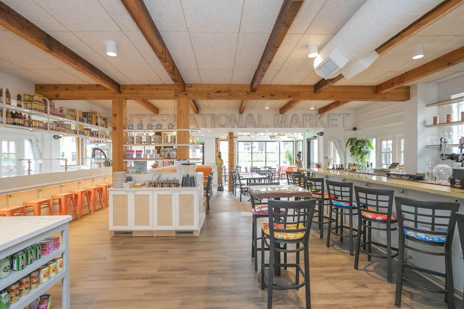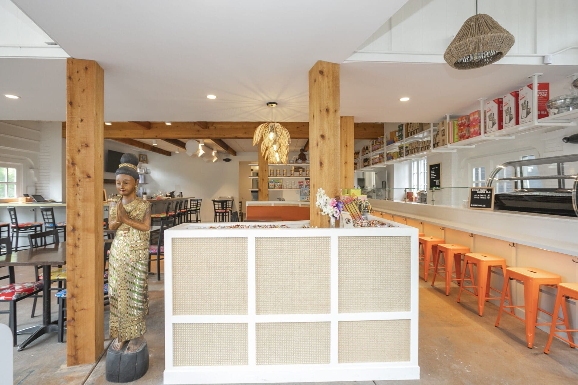 When Nashville's favorite International Market was pushed out of its longtime home on historic Belmont Boulevard after 45 years, Anna and Arnold Myint, the family who owned it, teamed up with MZA to reimagine their family's legacy across the street. Honoring the much-loved original and the need for a fresh start in the new space, MZA created a space that blends seamlessly between nostalgia and hip style. The original bright orange booths and outside signage provide cheerful nods to the past, while teak wood carved doors and graphic orange floor tile provide warmth and character. Strategically selected, the new, bright interior highlights the bright colors of the market's product displays. Now fondly known as IM2, the reborn restaurant and market continues to be a neighborhood institution for everyone who has supported this staple of Nashville’s culture for years.