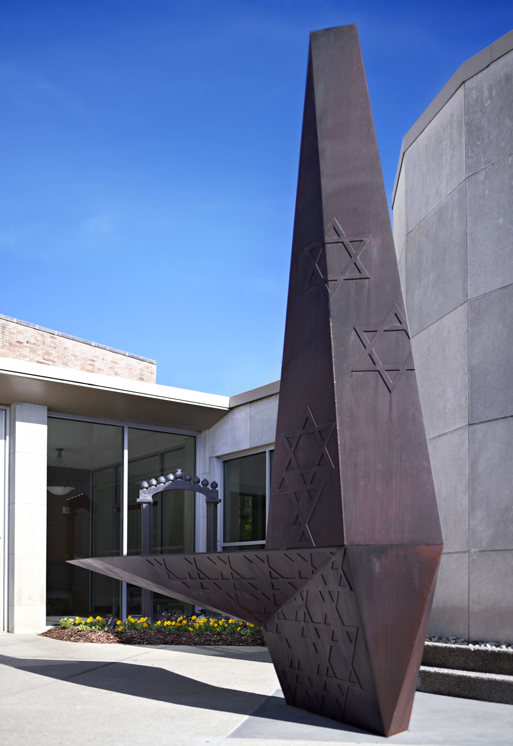 MZA was commissioned by The Temple, Congregation Ohabai Sholom in Nashville, to create a sculptural, dramatic Ark and Bimah to support outdoor worship. Asked to create a powerful point of attention that would be a balance to the temple courtyard and be eye-catching, MZA designed a kinetic form rising out of the earth and directed towards the sky, symbolizing the tree of life. Crafted in steel with a warm patina finish that complements adjacent natural stone, the sculpture's faceted surfaces stunningly reflect sunlight, creating a captivating dance of shadows. The outcome is an enduring centerpiece that enriches the congregation’s outdoor worship by enhancing their bond with nature and their sacred space.