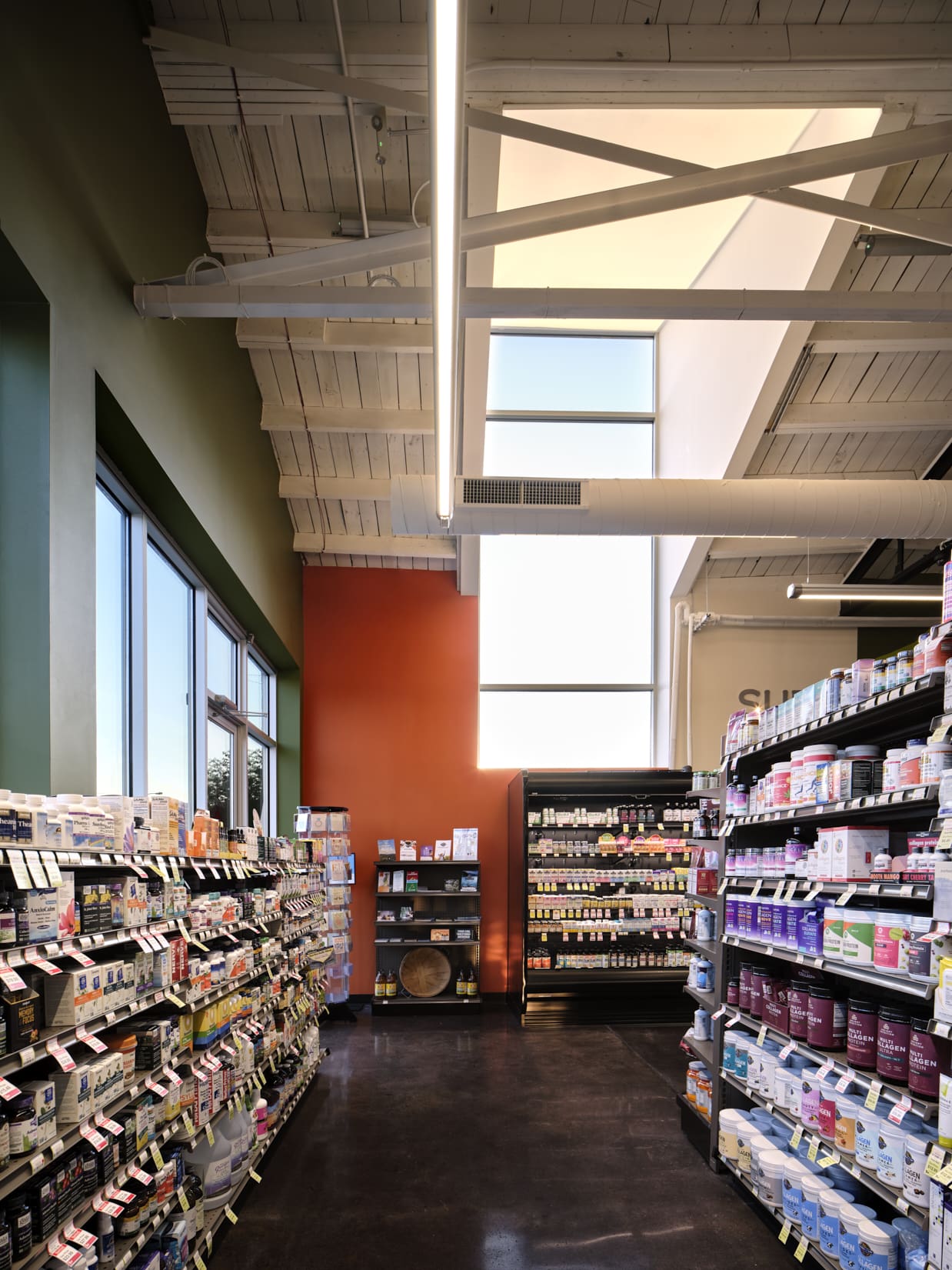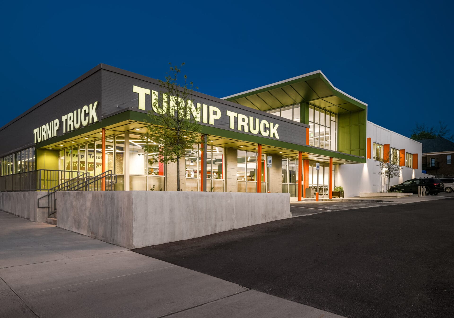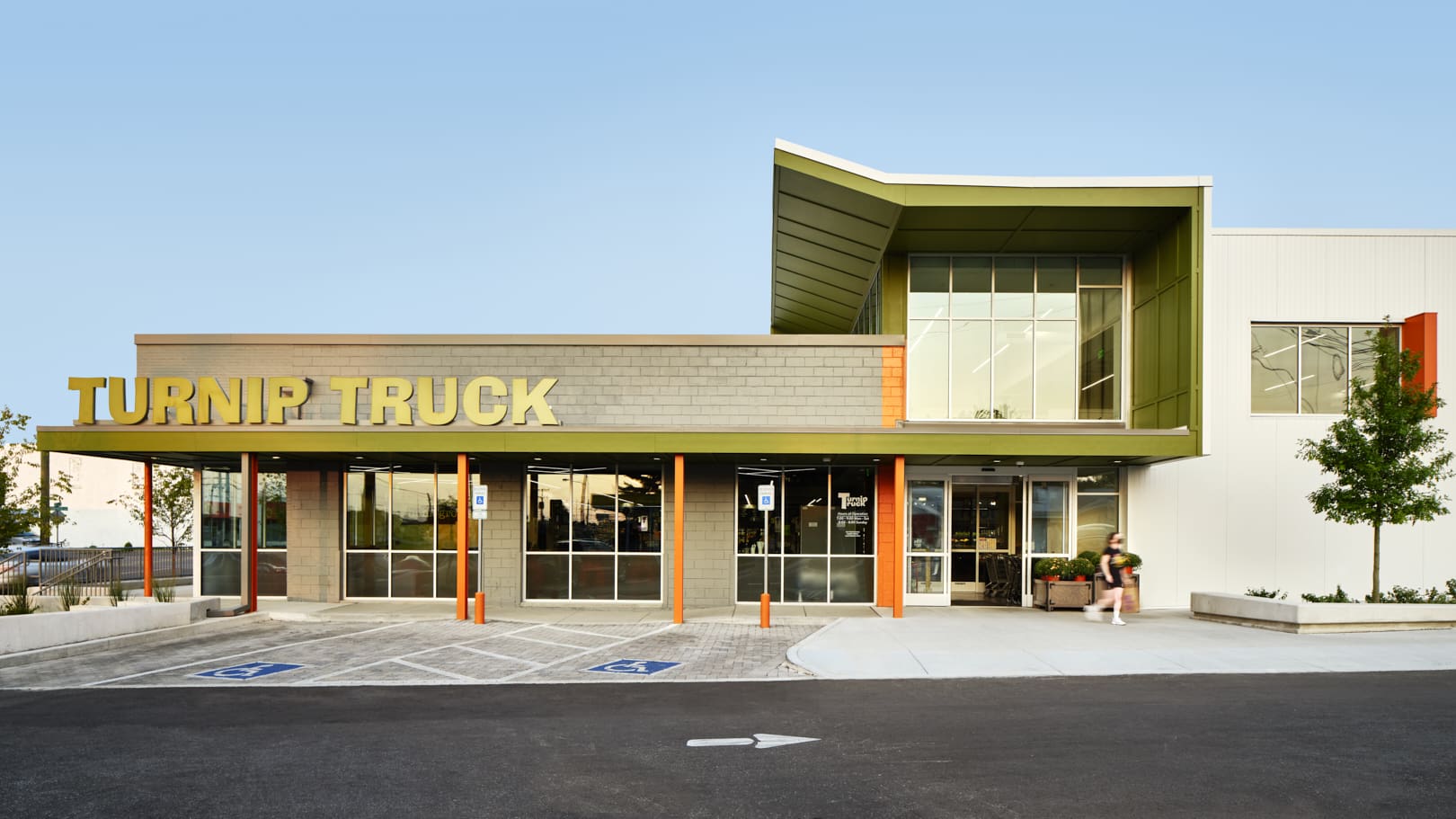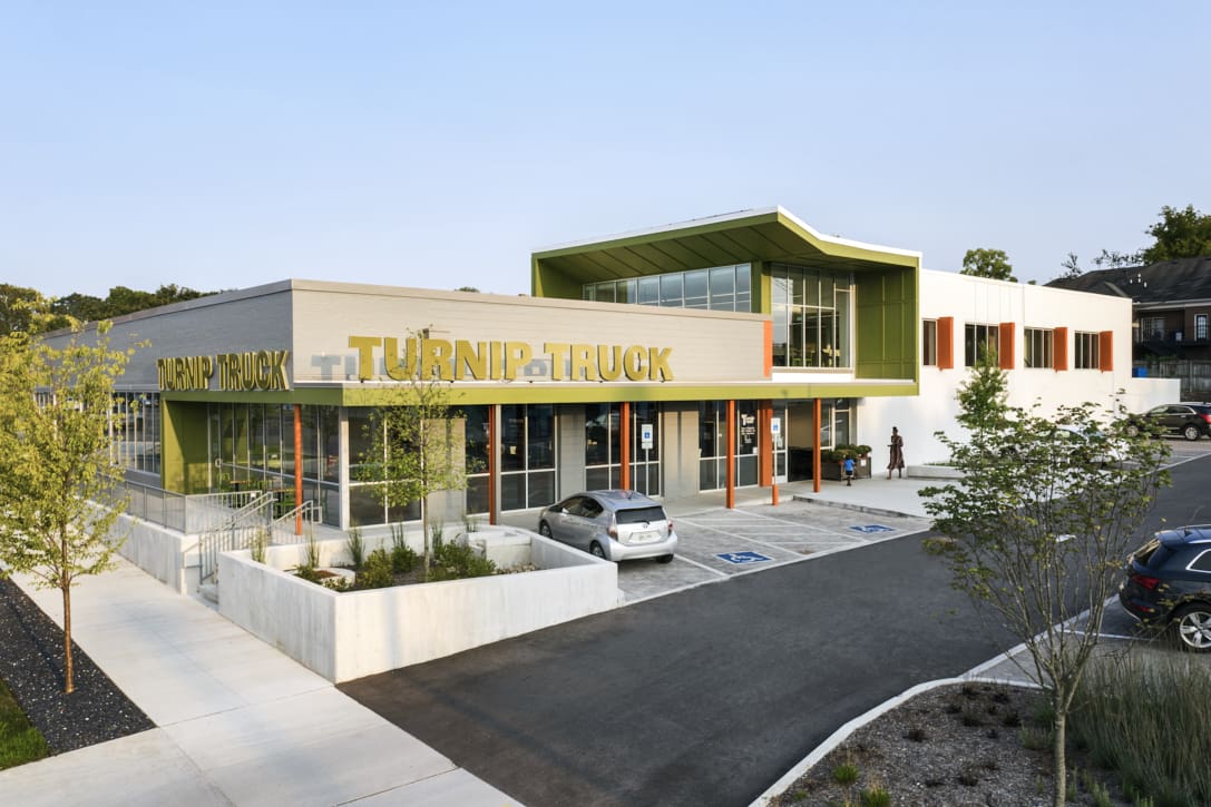 As Turnip Truck expanded west, MZA renovated an existing Cash & Carry into a full-service market near Sylvan Park. The transformation kept much of the existing building's masonry, supplementing it with new volumes and green infrastructure at the top to support the grocer's mission. A dramatic corner entrance draws customers in with an iconic green ribbon wrapping around the façade and shading the storefront. Bioretention areas, pervious paving, and rooftop solar panels turn a once-impervious site into a sustainability success story. Inside, MZA exposed the building’s barrel vault roof, removed layers of ceilings, and maximized daylight. A mezzanine offers office space and overlooks the bustling store below. With its green roof-capable rooftop canopy and sunlight streaming through an oversized east window in the morning, the building is both smart and spiritual, contributing clean energy (and fresh vegetables) to the community of West Nashville.
