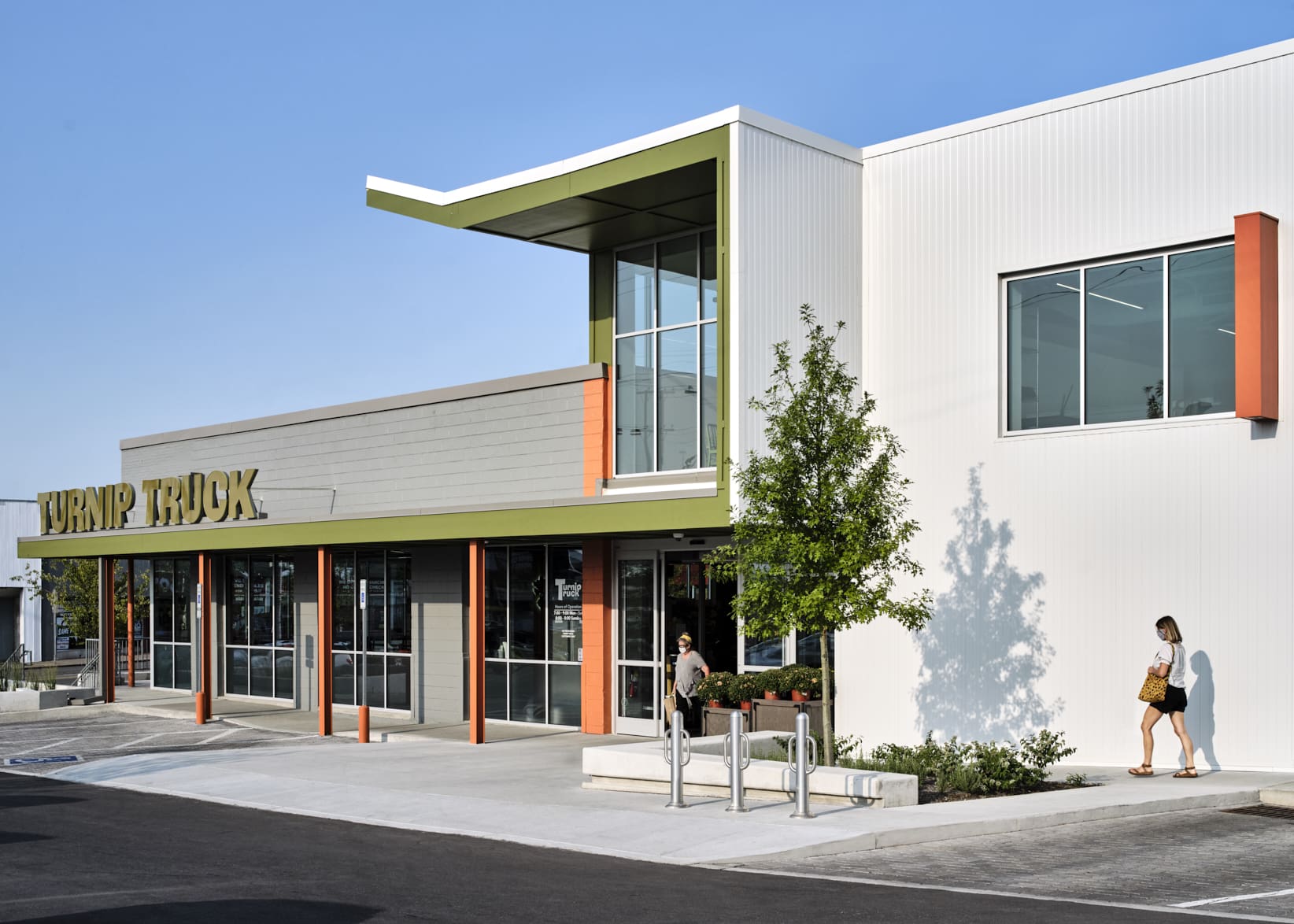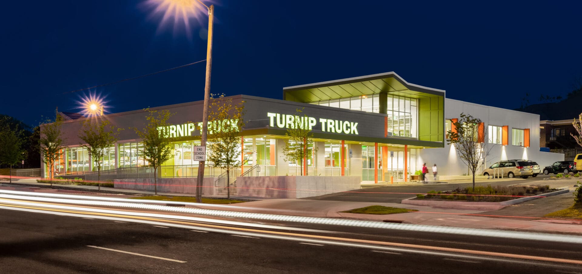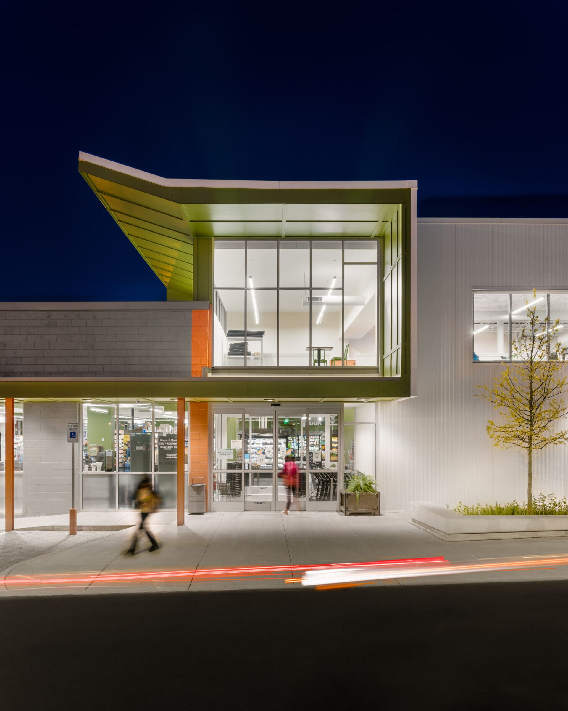As Turnip Truck expanded west, MZA renovated an existing Cash & Carry into a full-service market near Sylvan Park. The transformation kept much of the existing building's masonry, supplementing it with new volumes and green infrastructure at the top to support the grocer's mission. A dramatic corner entrance draws customers in with an iconic green ribbon wrapping around the façade and shading the storefront. Bioretention areas, pervious paving, and rooftop solar panels turn a once-impervious site into a sustainability success story. Inside, MZA exposed the building’s barrel vault roof, removed layers of ceilings, and maximized daylight. A mezzanine offers office space and overlooks the bustling store below. With its green roof-capable rooftop canopy and sunlight streaming through an oversized east window in the morning, the building is both smart and spiritual, contributing clean energy (and fresh vegetables) to the community of West Nashville.