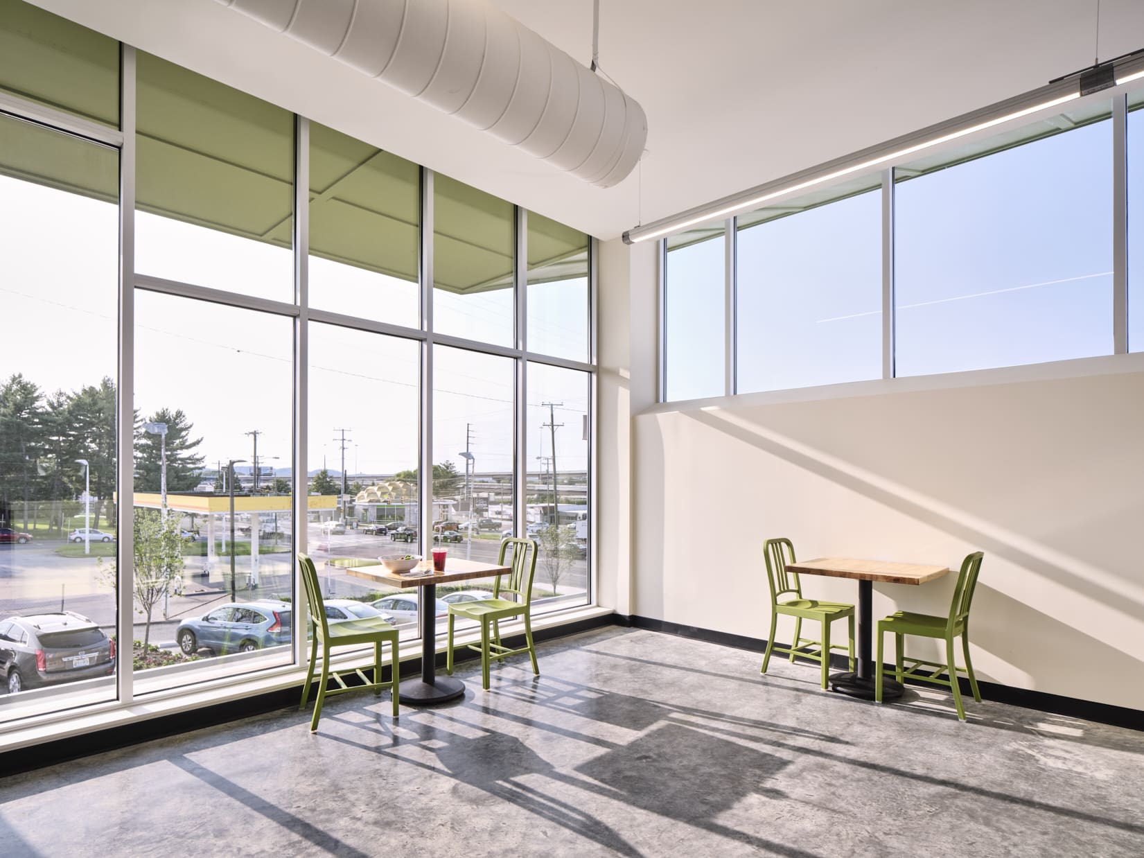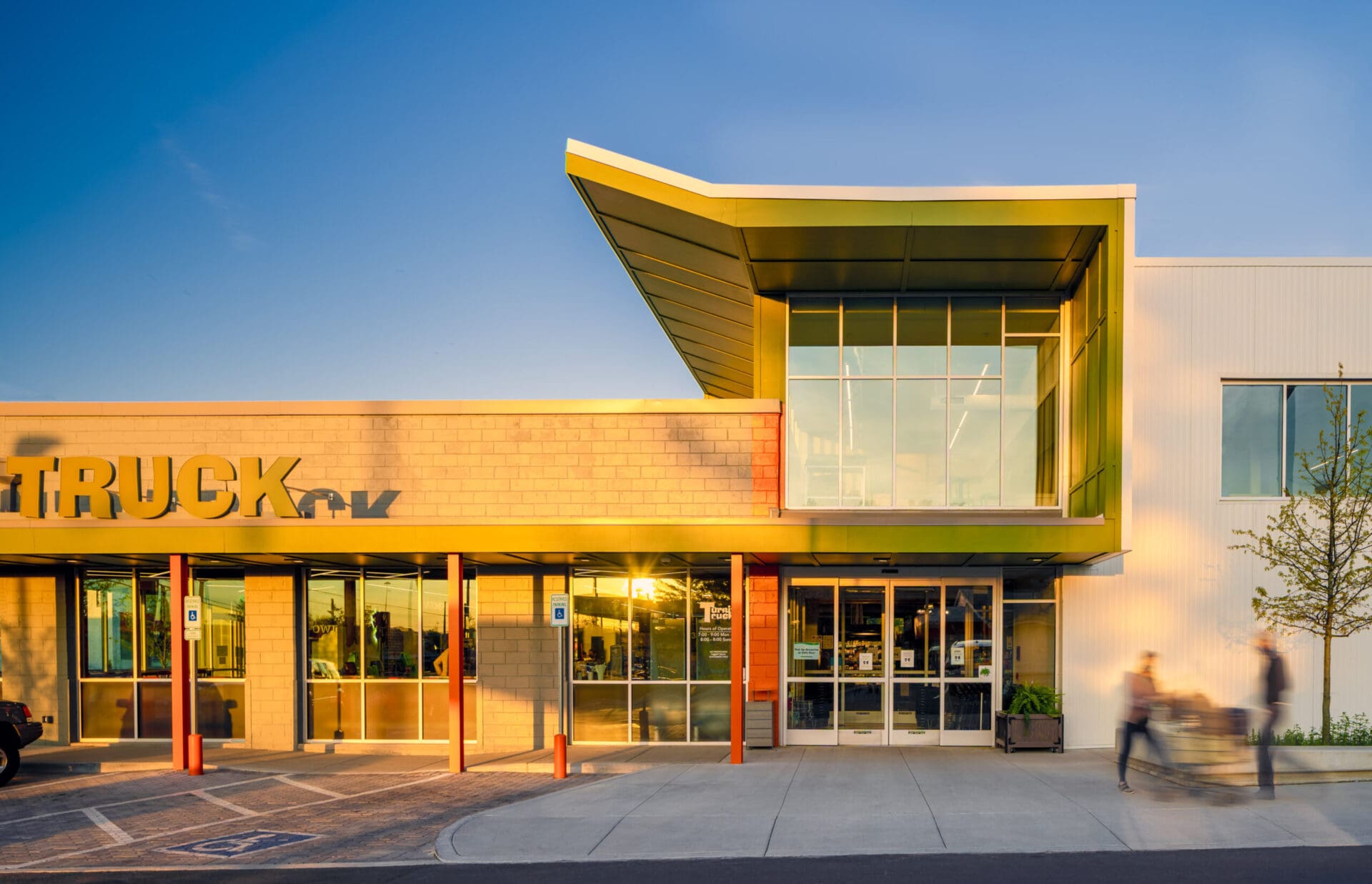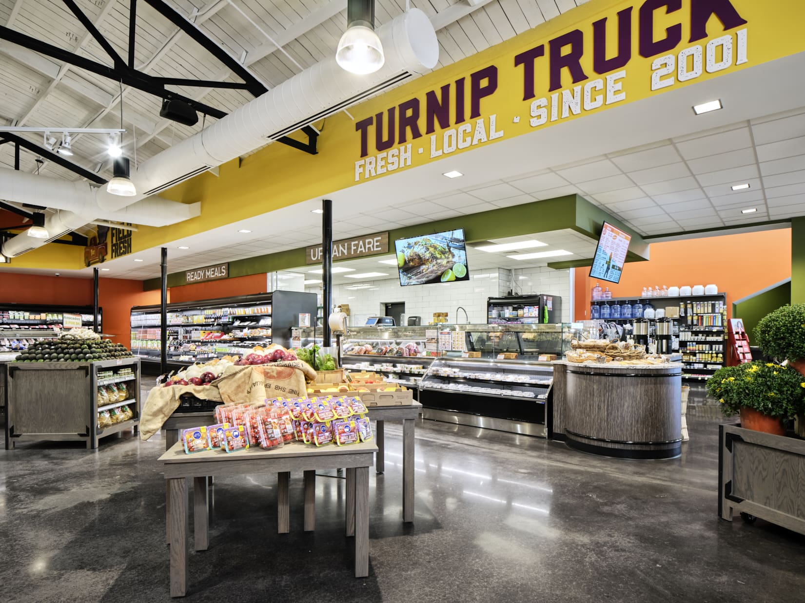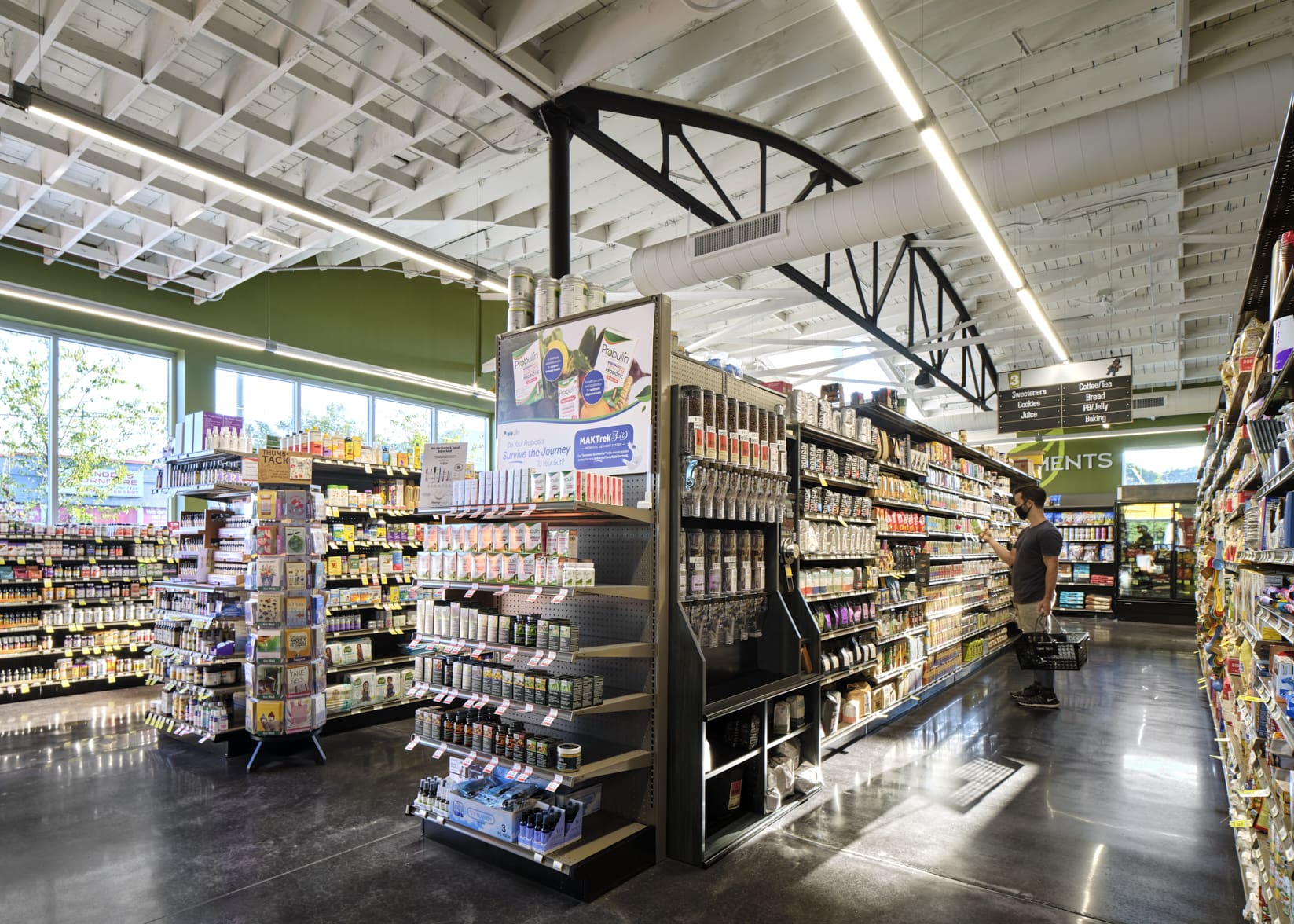 As Turnip Truck expanded west, MZA renovated an existing Cash & Carry into a full-service market near Sylvan Park. The transformation kept much of the existing building's masonry, supplementing it with new volumes and green infrastructure at the top to support the grocer's mission. A dramatic corner entrance draws customers in with an iconic green ribbon wrapping around the façade and shading the storefront. Bioretention areas, pervious paving, and rooftop solar panels turn a once-impervious site into a sustainability success story. Inside, MZA exposed the building’s barrel vault roof, removed layers of ceilings, and maximized daylight. A mezzanine offers office space and overlooks the bustling store below. With its green roof-capable rooftop canopy and sunlight streaming through an oversized east window in the morning, the building is both smart and spiritual, contributing clean energy (and fresh vegetables) to the community of West Nashville.